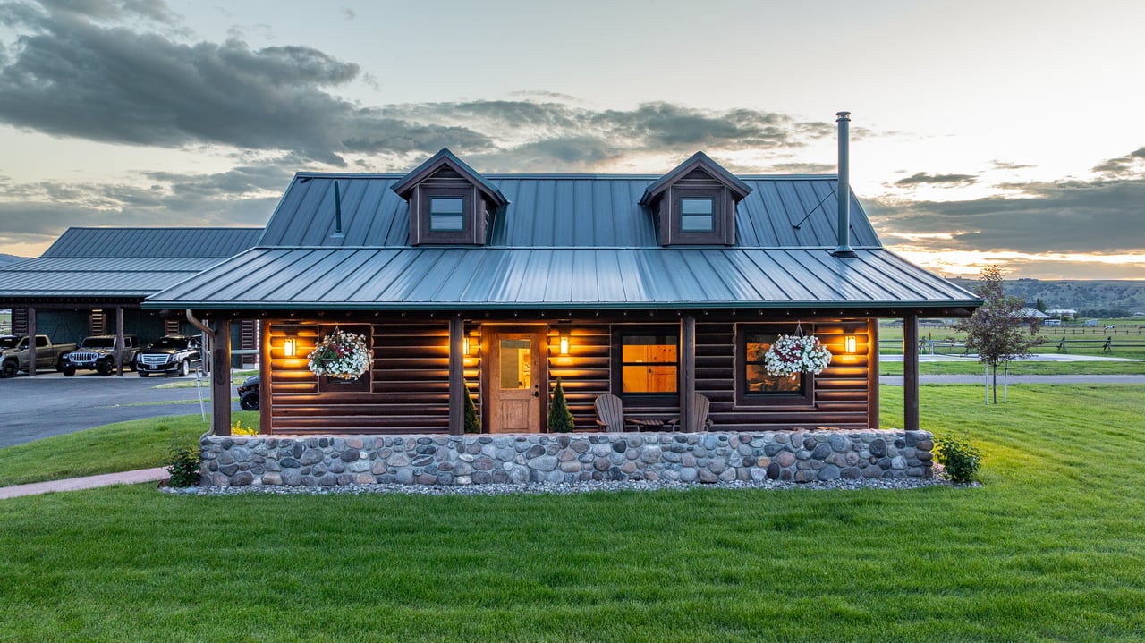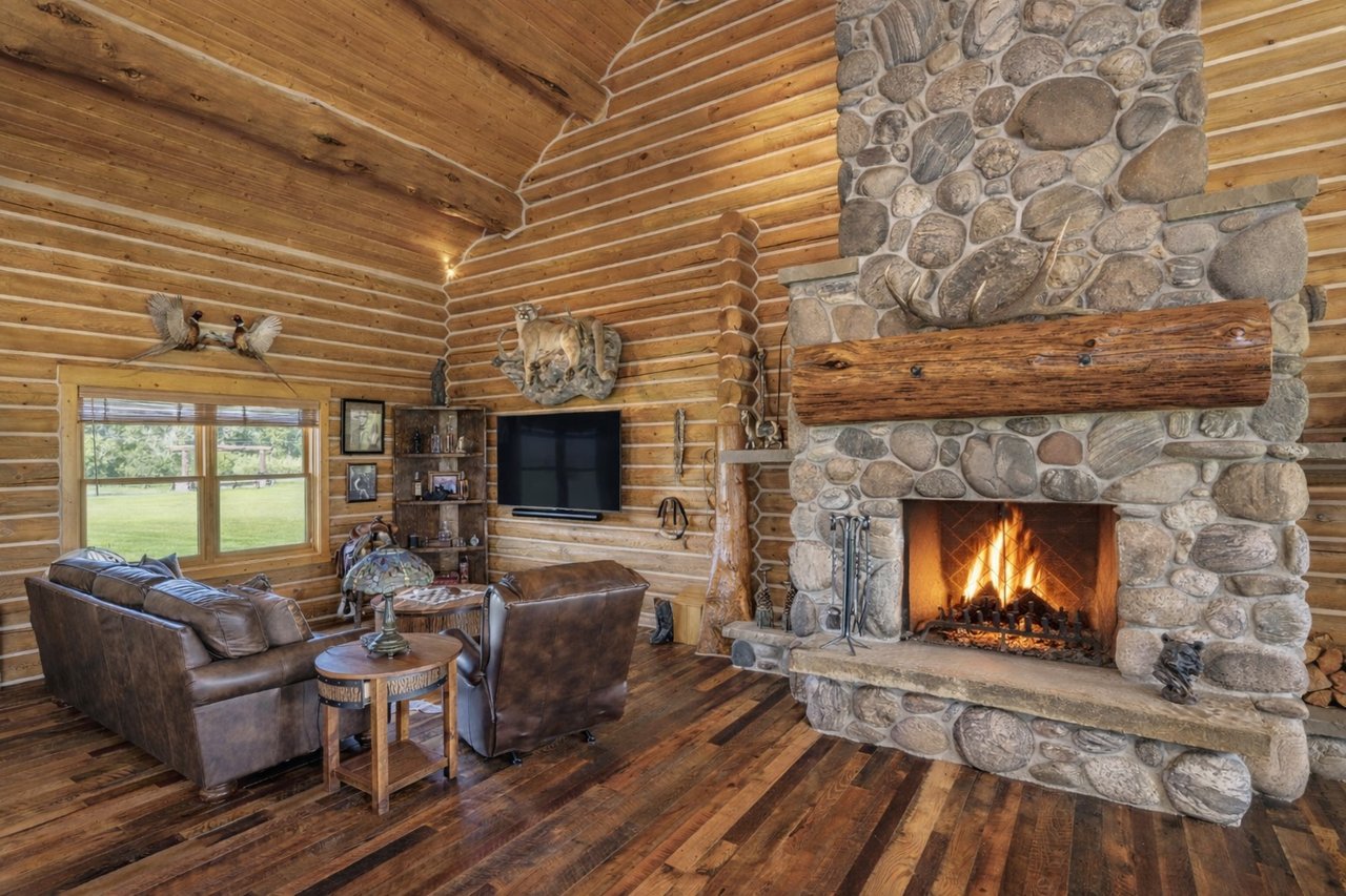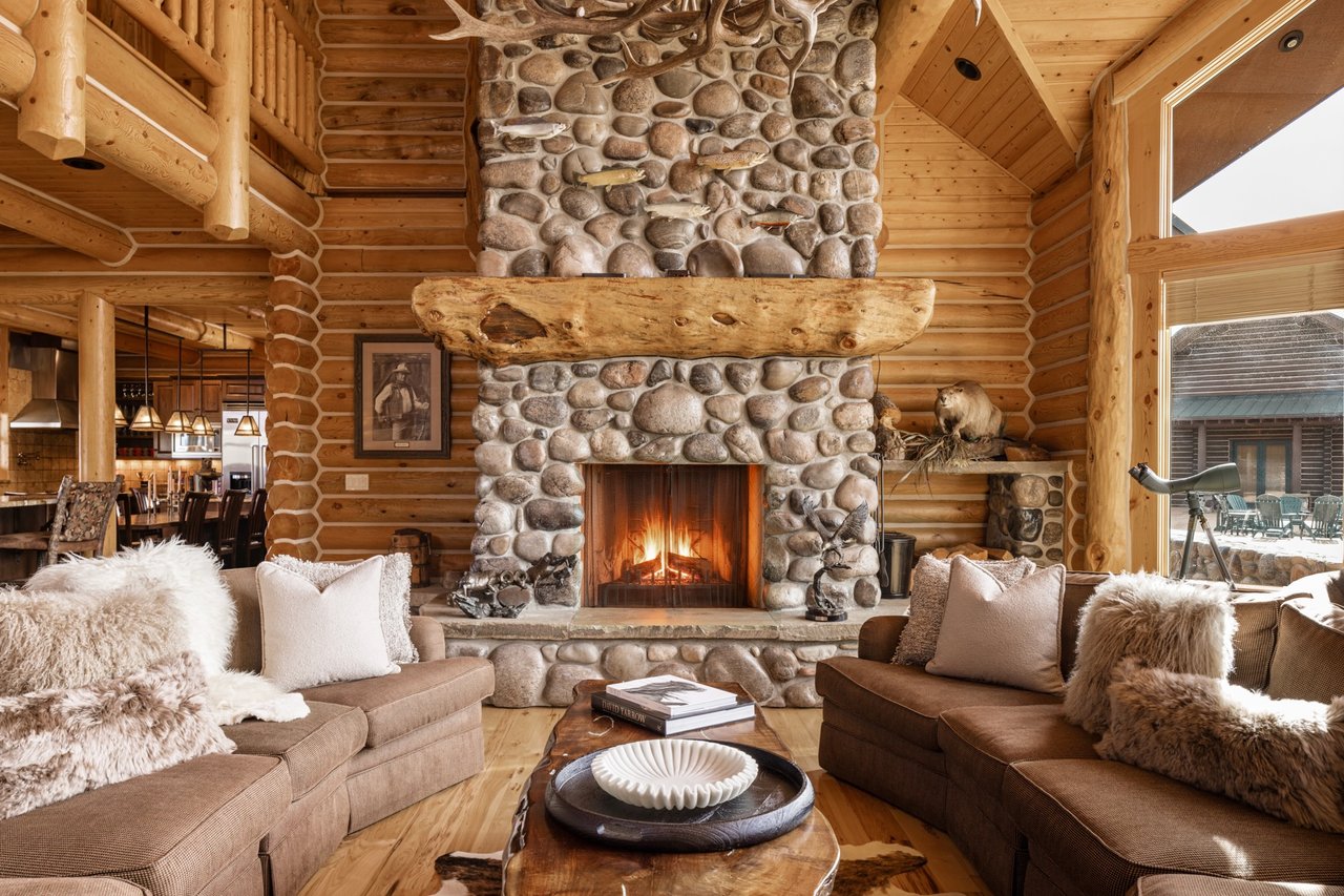 At its heart stands the main estate—a custom five-bedroom, five-bath log home built with the craftsmanship and permanence this landscape demands. Designed for generations, this 6,612-square-foot retreat is as enduring as the river that runs through the property itself. Anchored by a soaring great room with a floor-to-ceiling river rock fireplace and windows overlooking the pastures, the home is warm, generous, and built for earned comfort. Golden hand-hewn logs set the tone throughout while wrought iron fixtures and granite countertops speak to craftsmanship and intention.